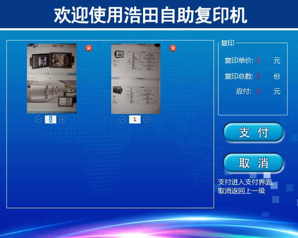 把文檔/圖片放入掃描框內,自動識別掃描進系統,在預覽區顯示,點擊【結賬】后后按照您復印的內容加減份數,最后點【支付】