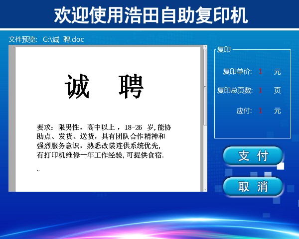 在界面上找出要打印的文件,點擊然后按【確認】,在預覽區預覽無誤后點擊【支付】。