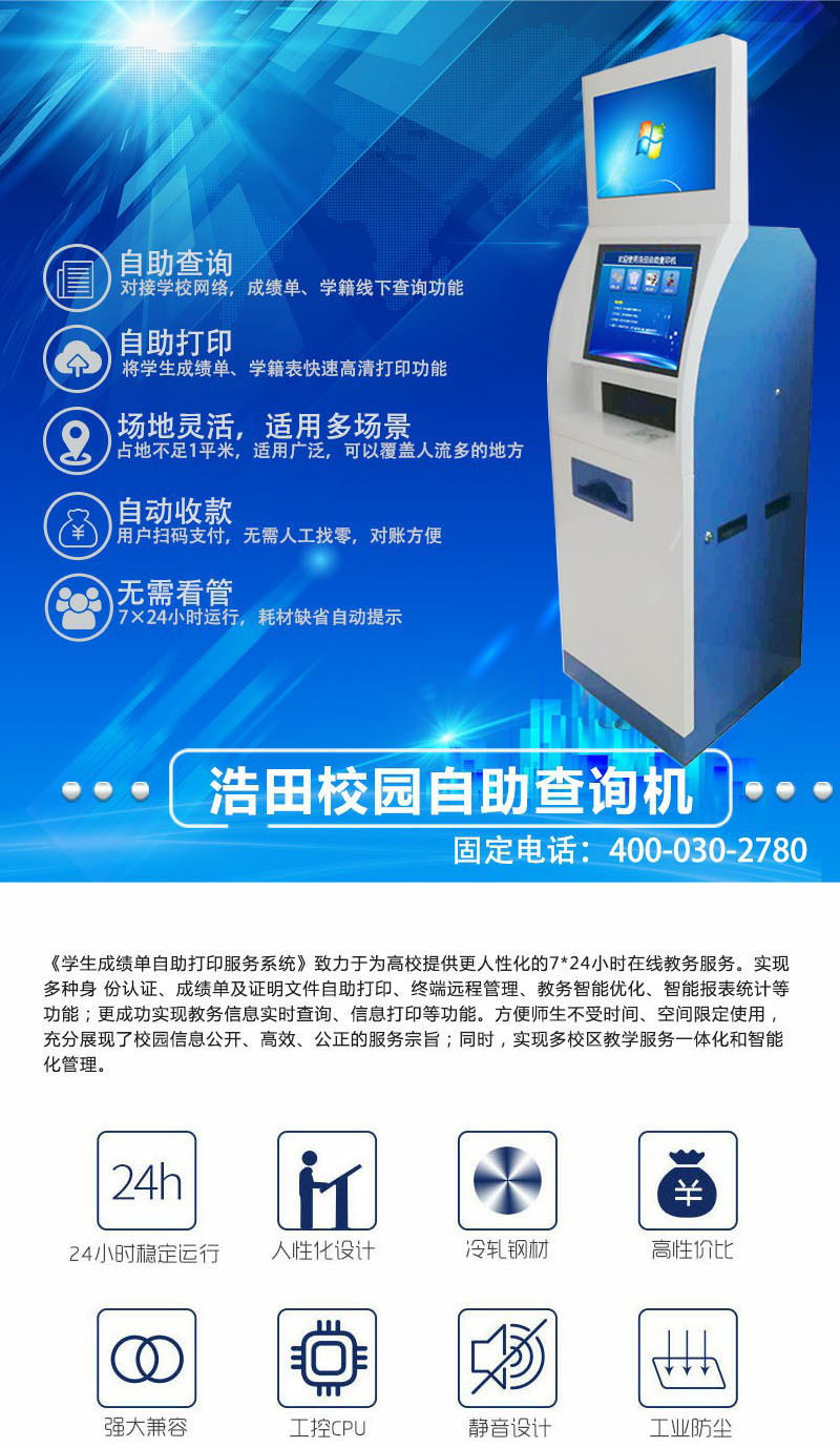 教務(wù)管理工作繁重。學(xué)院學(xué)生人數(shù)眾多,打印量大,若全都由老師來幫助學(xué)生打印,太耗時間。每年招生人數(shù)還在增加,這意味著教職人員的工作量在不斷增加。對于學(xué)院教務(wù)處來說,對學(xué)生的教學(xué)管理才是重點(diǎn),浩田自助查詢打印機(jī)老師把打印學(xué)生成績的工作時間節(jié)省下來,以最大程度減輕相關(guān)工作人員的工作量提高教務(wù)工作者的工作效率。