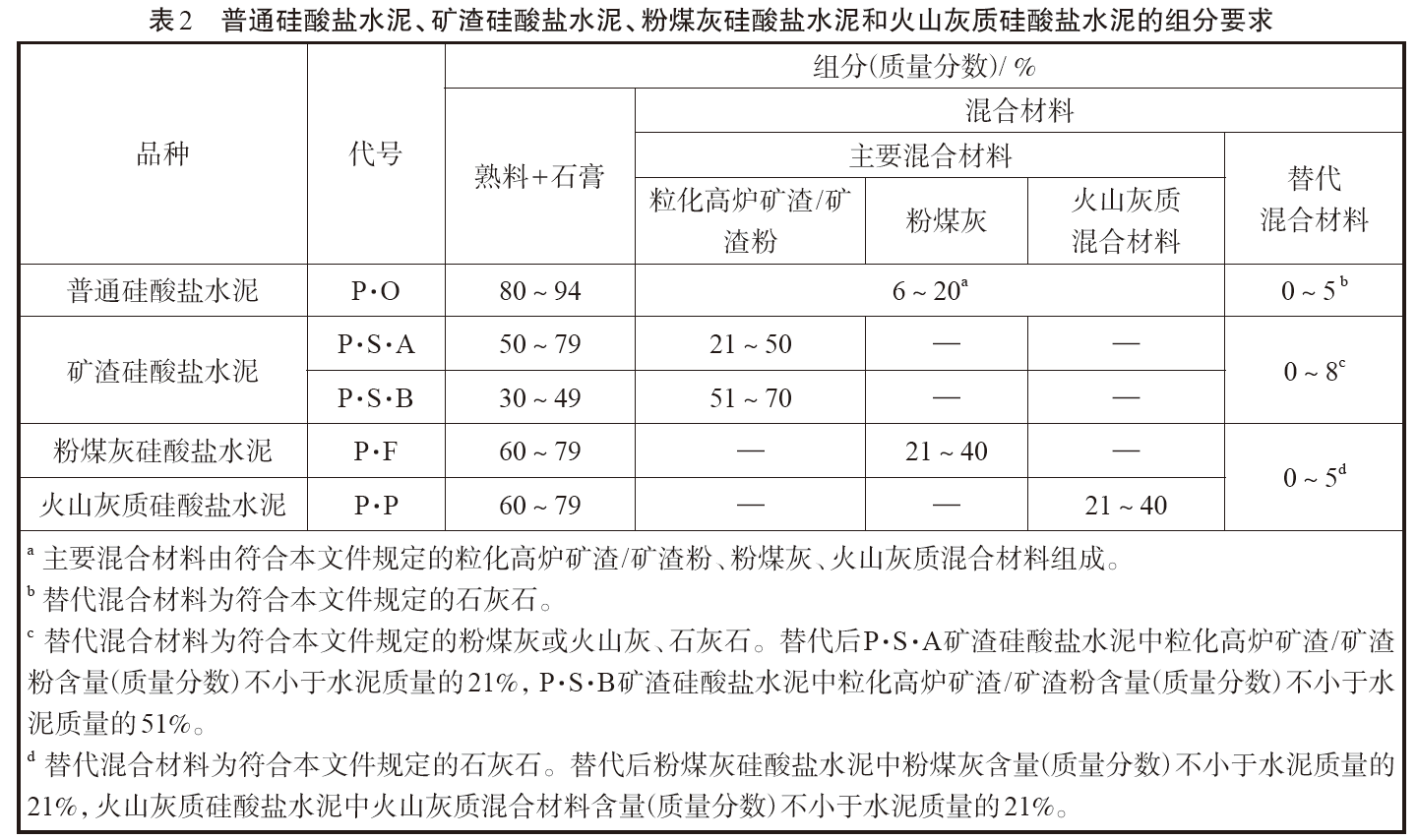 本次標準修訂為:主要混合材料的允許摻量為大于等于6% 且小于等于20%,其中可以使用小于等于5%的替代混合材料替代主要混合材料。這里的主要混合材料是指符合標準規定的粒化高爐礦渣/ 礦渣粉、粉煤灰、火山灰質混合材料,可以是一種材料單獨使用也可以是兩種或三種材料復合使用。替代混合材料則指石灰石。具體見表2 中的備注a和b。