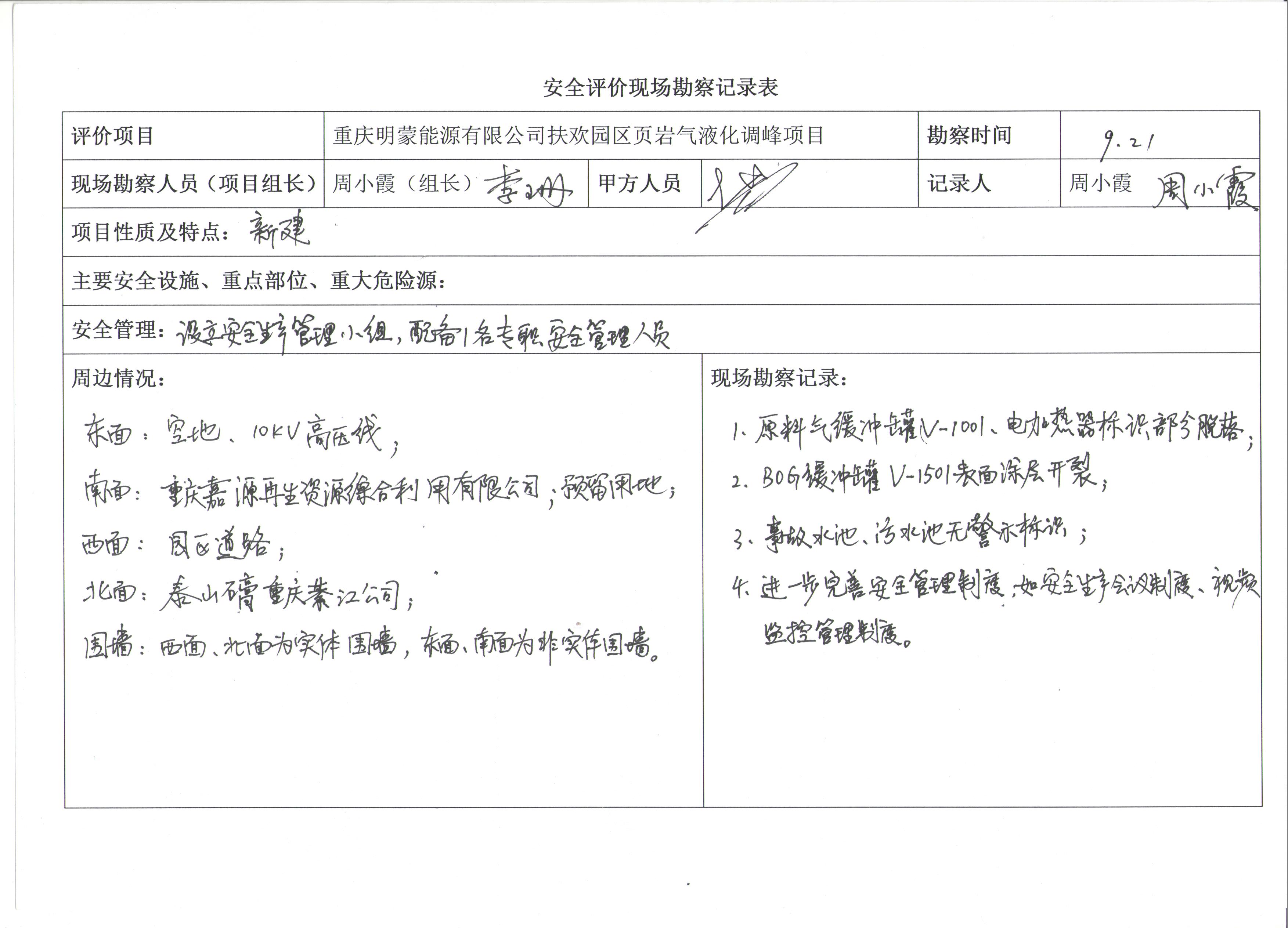 項目名稱 | 重慶明蒙能源有限公司扶歡園區頁巖氣液化調峰項目安全驗收評價 | 合同編號 | DA(渝)-PJ-20230901 | |||||