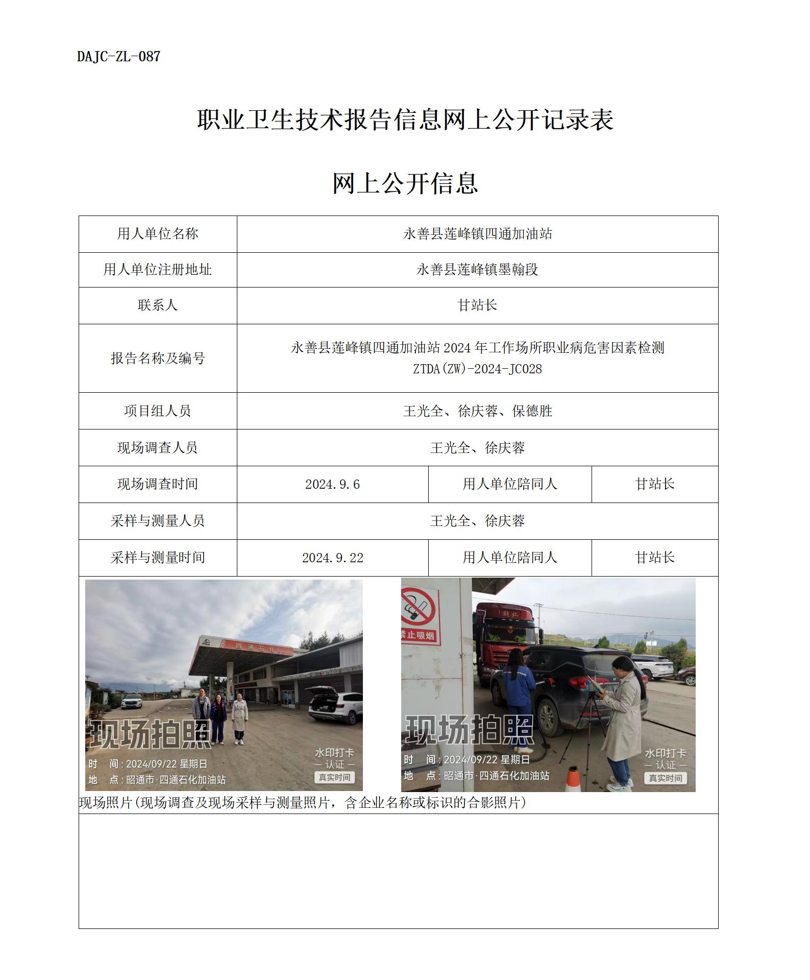 永善縣蓮峰鎮(zhèn)四通加油站2024年工作場(chǎng)所職業(yè)病危害因素檢測(cè) ZTDA(ZW)-2024-JC028
