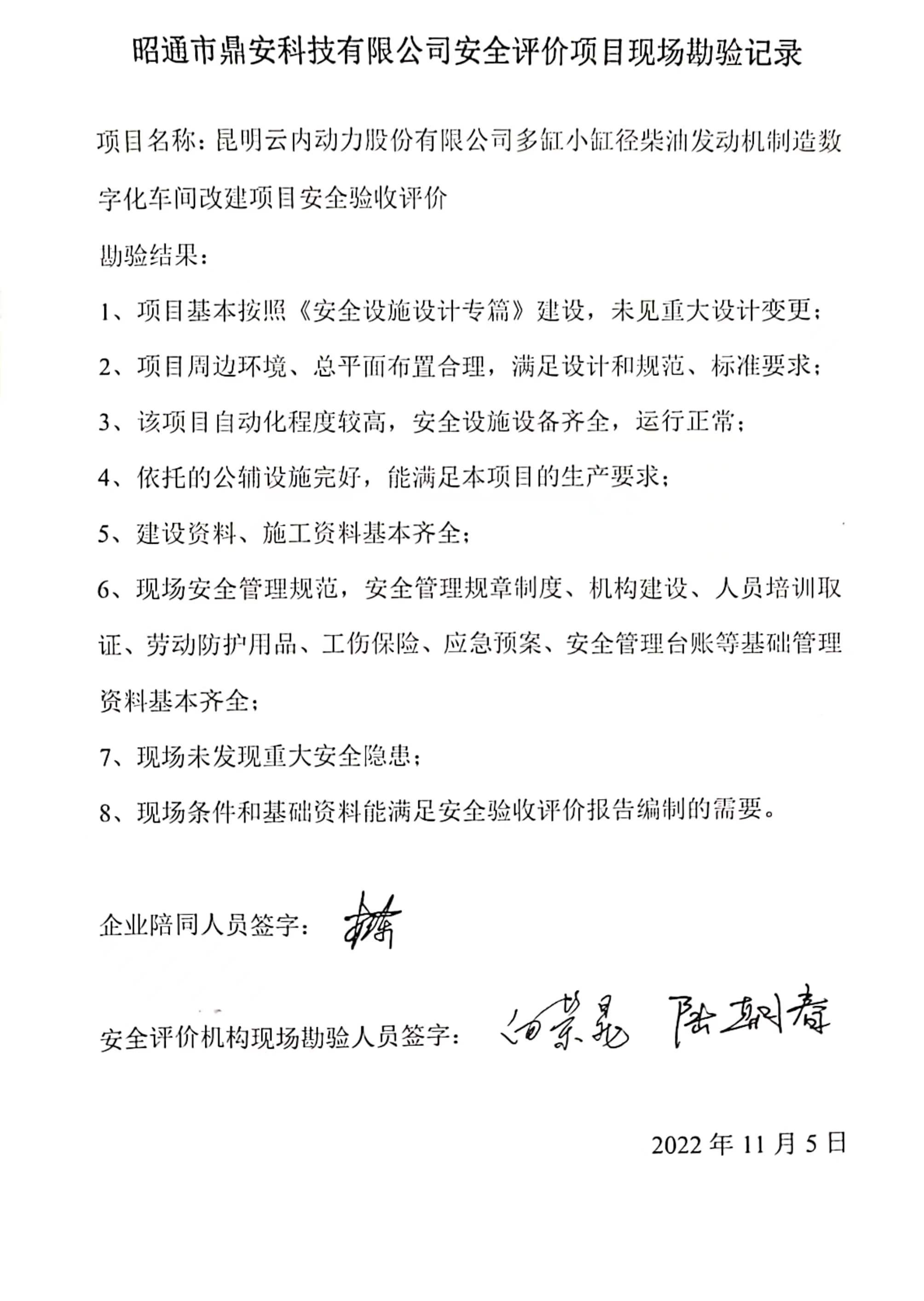 昆明云內動力股份有限公司多缸小缸徑柴油發動機制造數字化車間改建項目符合國家有關安全方面的法律、法規、標準、規程、規章的有關要求,本項目安全設施設計的規定得到貫徹和落實,具備安全驗收條件。